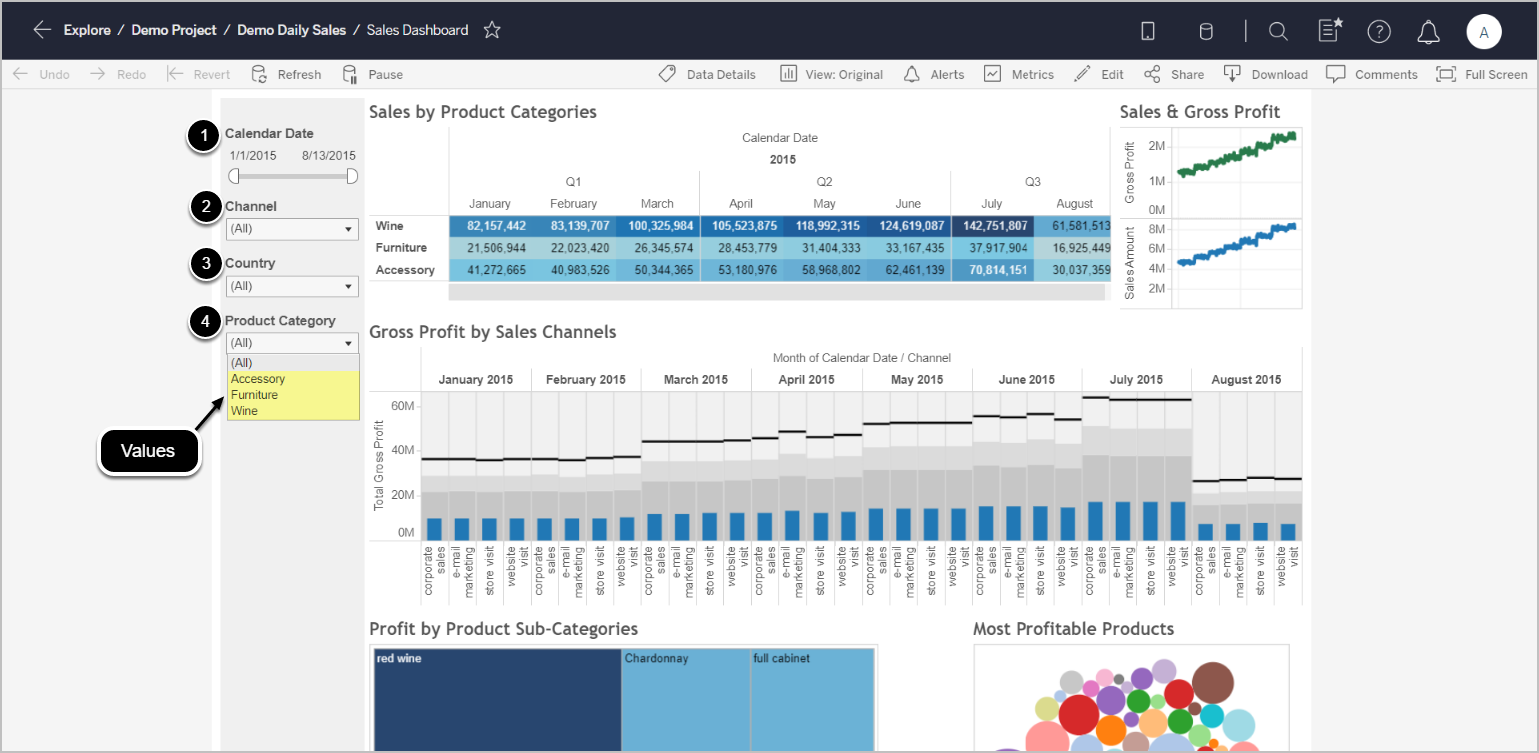 On the example below, all available filters are located to the left of Sales Dashboard. They can also be located at the top or to the left of the View. The given example allows modifying the View by including or excluding values from the following filters: