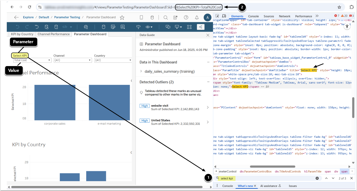 - To test it, append &ParameterName=ParameterValue to the Tableau URL and check if the intended page opens correctly with the Parameter applied. If the page loads correctly, this confirms the correct Parameter-Value pair to use in Metric Insights, i.e.: Select20%KPI and Total20%Cost.