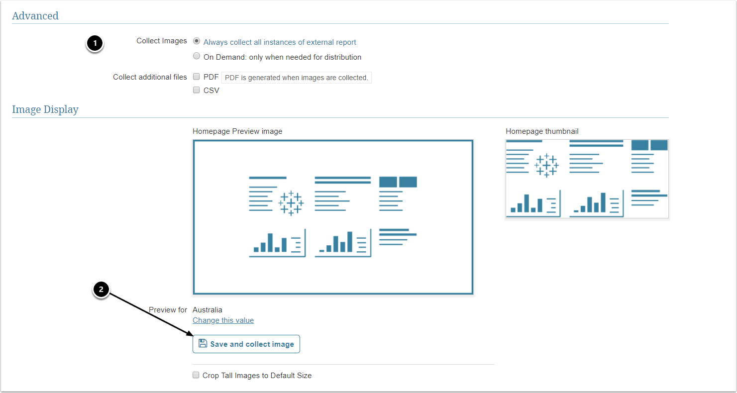 - Click Save and collect image to create the Preview and Thumbnail images for display on the Homepage and Notifications.