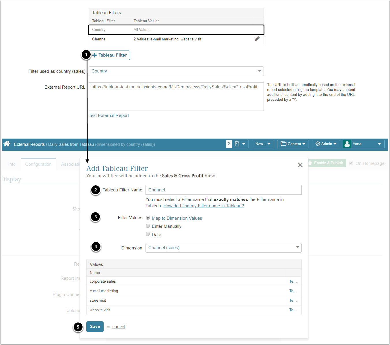 - If your External Report is Dimensioned, you must map the Dimension you have used for this Report to the corresponding Tableau Filter (this External Filter is considered "required"). Otherwise, you will not be able to save your Report.