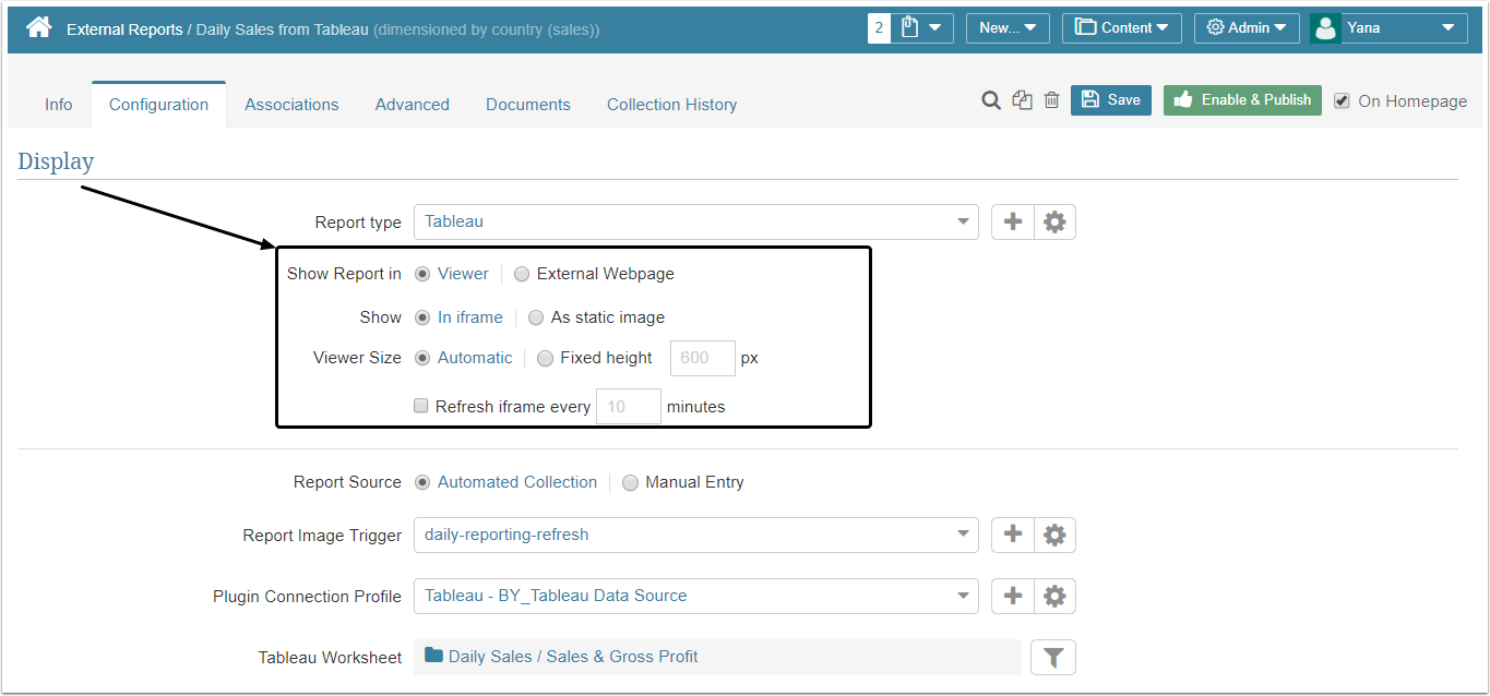 Viewer: the Tableau external Report is embedded into the Metric Insights Viewer. There are several ways to display your External Report in Viewer: