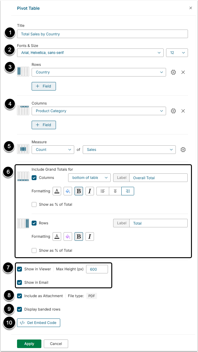 - Show in: Define if the pivot table will be shown in Viewer and Emails.