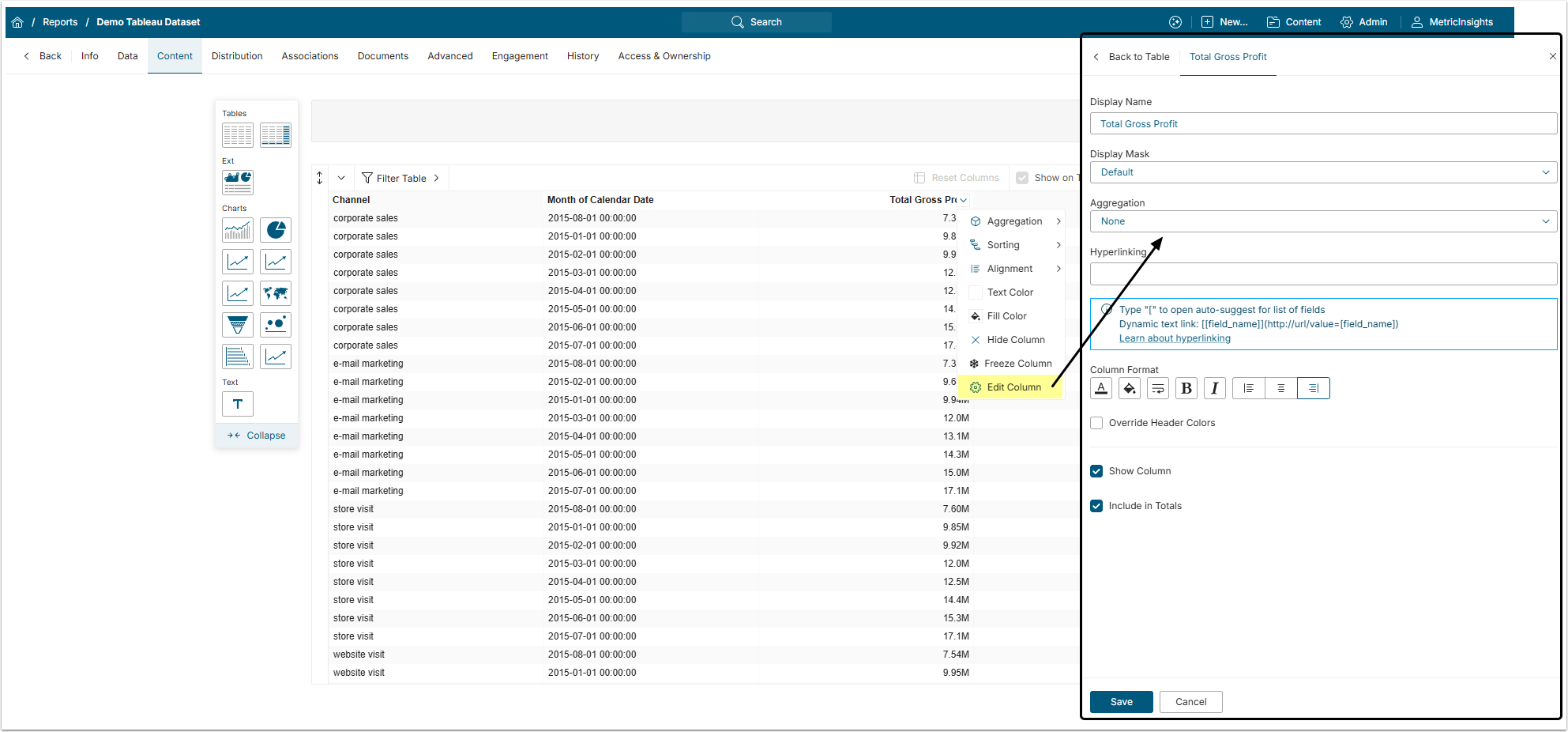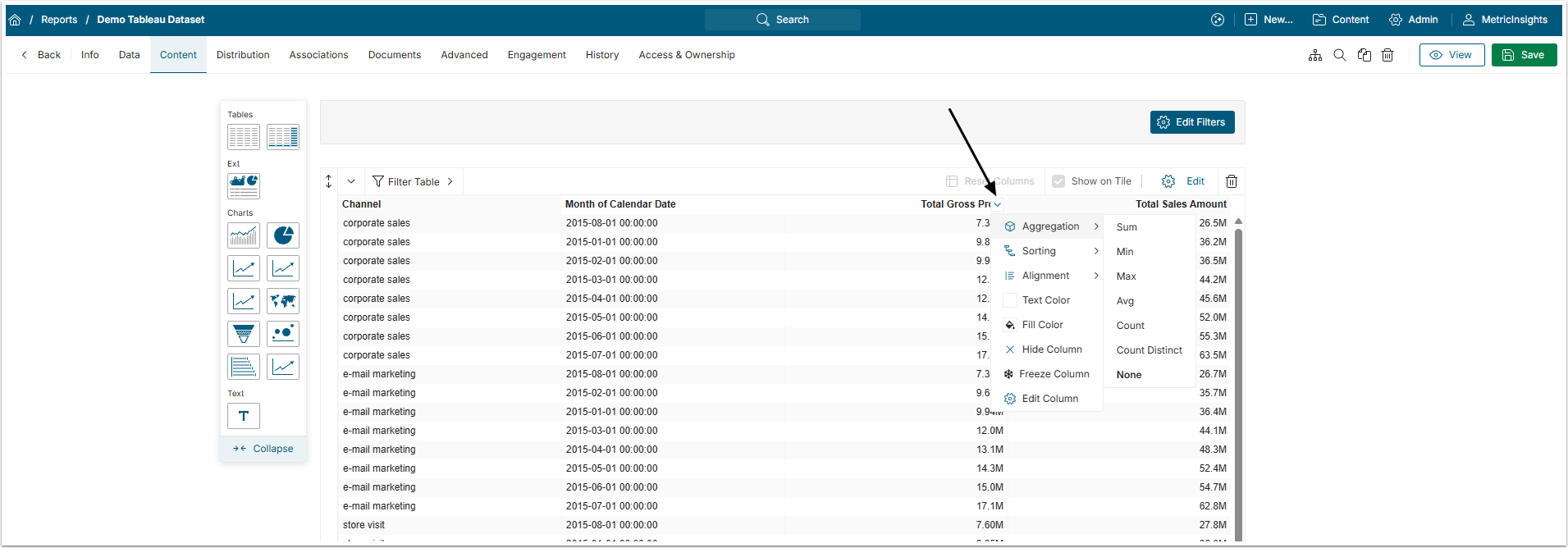 Metric Insight has the functionality to aggregate numeric fields directly in the Report without the need to create a new View first. The Report function mimics the ability in the Data Viewer. This article describes how to apply aggregation to the Report.