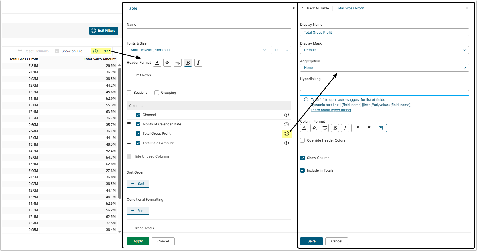 Click the arrow down icon on the numeric values column to open the column drop-down menu and click Edit Column. Select aggregation type in the Aggregation drop-down menu.