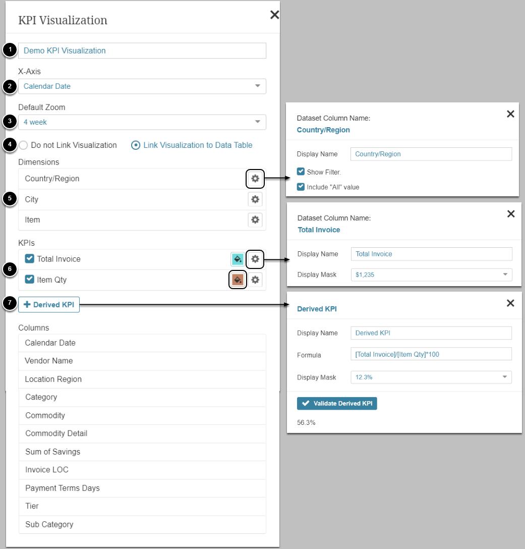 KPIs must include at least one value that is a measurement. Drag a column name from under Columns OR add a Derived KPI (see the following step). Order KPIs by dragging them.- NOTE: Columns must contain numeric data types. Data for these Columns will be aggregated by sum.