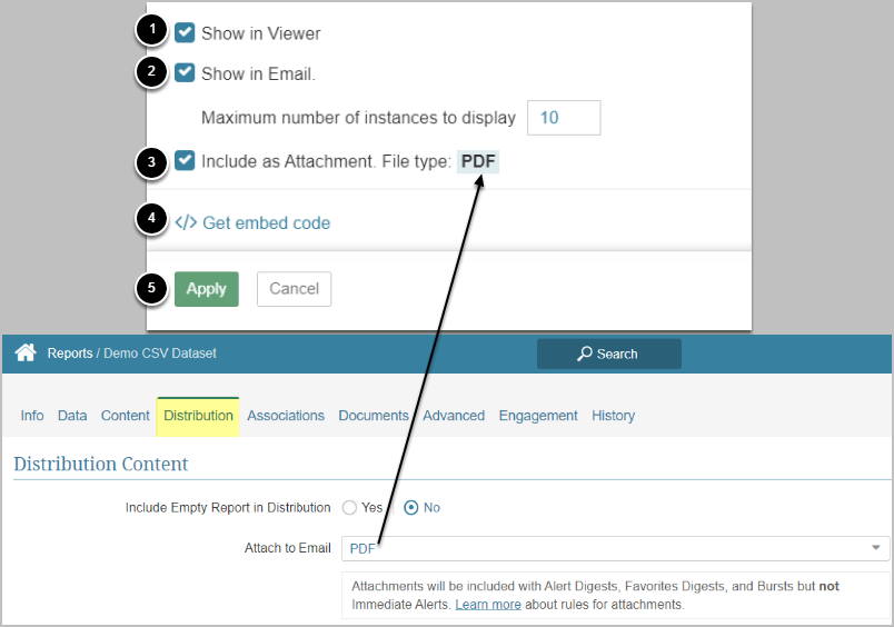 - Specify if you want the Visualization to be included in attachments with Alert Digests, Favorites, and Bursts. - File type can be configured on the Distribution tab.