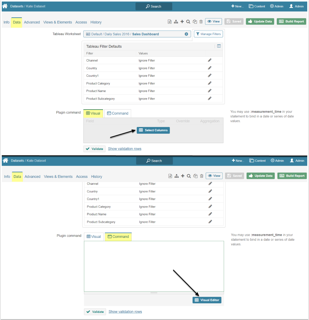 In this case is used a Tableau Data Source for the Dataset but the Visual Editor will look the same for any other Plugin.