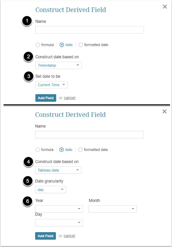 - Construct date based on: "Timestamp" option populates the Derived Field a date/timestamp