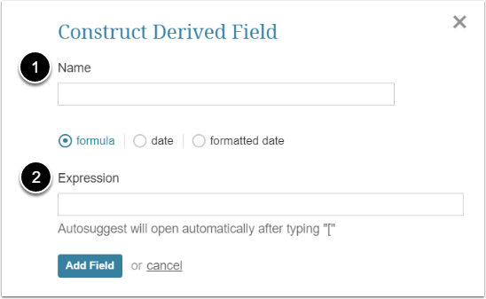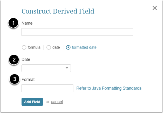 It is possible to insert an additional field with a formula or date to the Dataset by clicking [+ Derived Field].