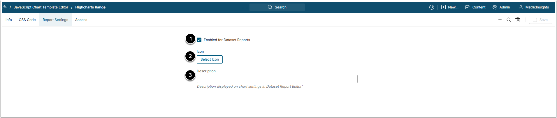 - Description: Input a Description to be displayed in the Dataset Report Editor/Chart Settings.
