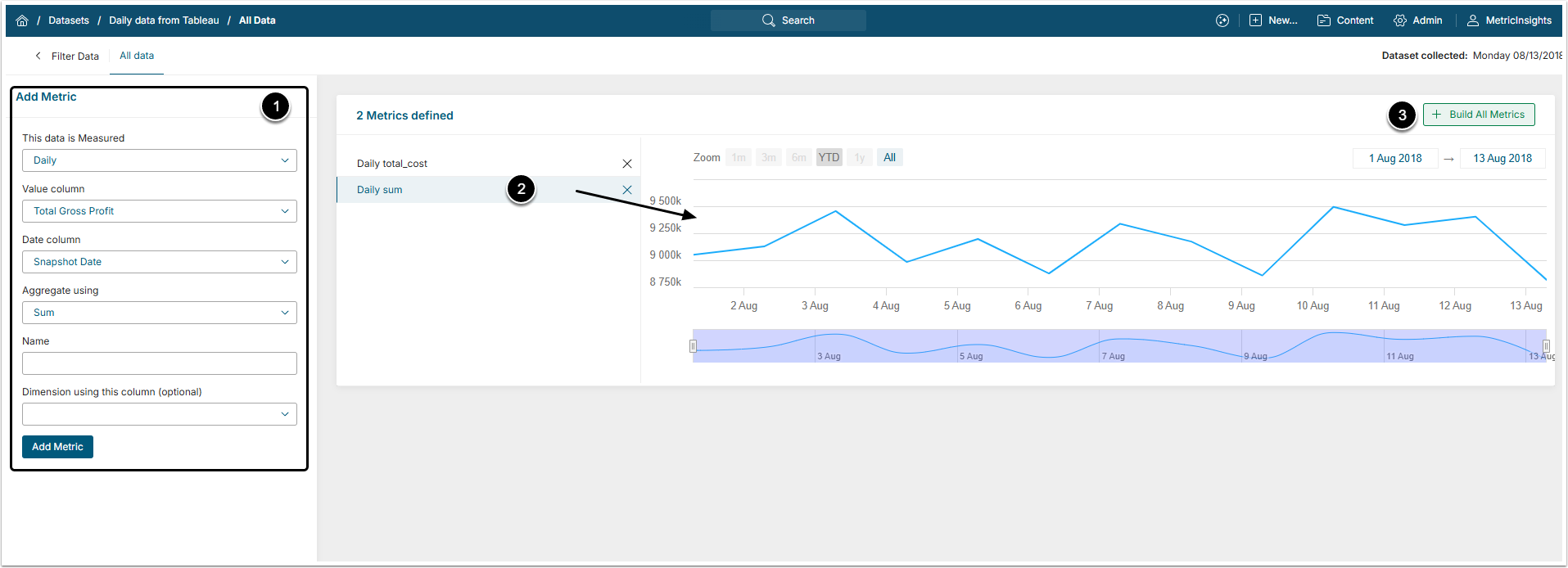 NOTE: Since Metrics always represent time series data, the source Dataset View must contain a date column and a column with values.