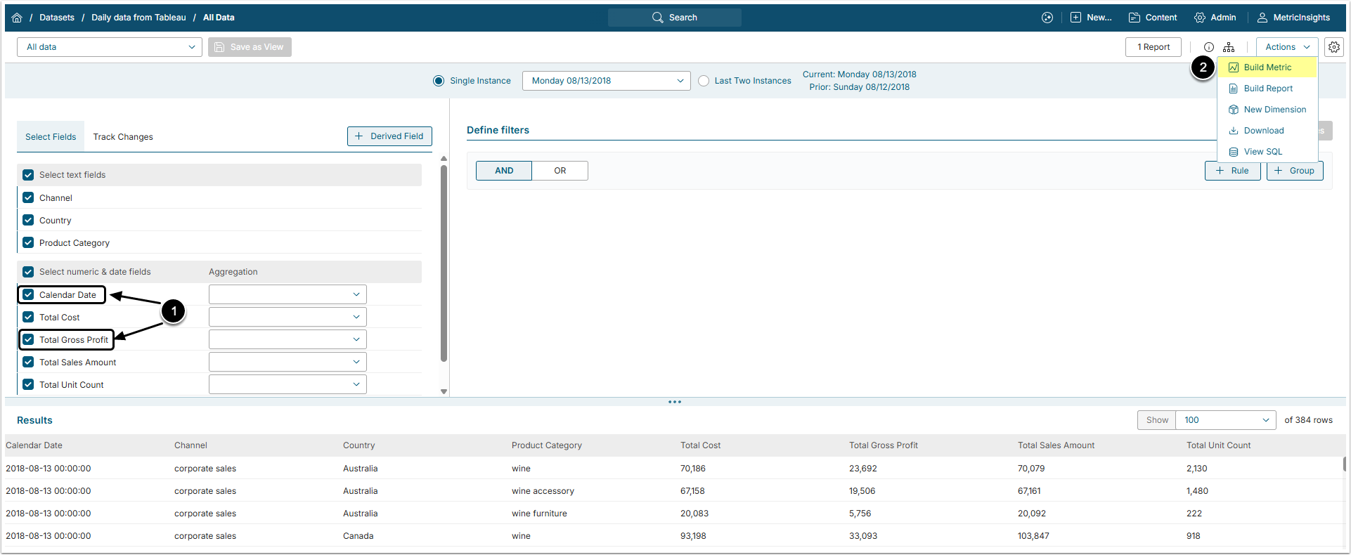 Admins and Power Users have an ability to create Metrics from a Dataset View. This way the User can minimize the number of data entry fields that are usually required to create a Metric. This article describes how to create a Metric from Dataset View.