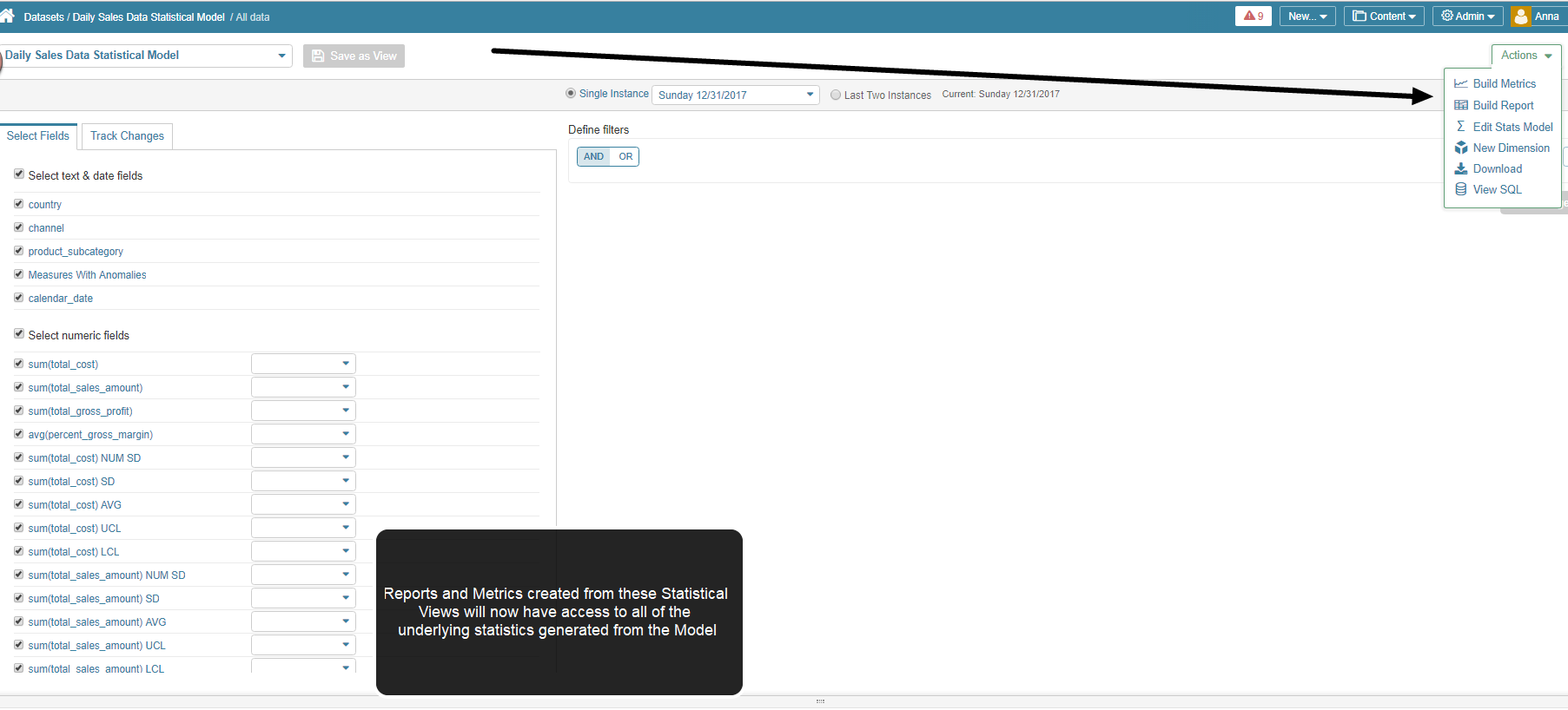 Metric Insights allows Users to easily create a Statistical Model to find anomalies in data containing a large number of Dimension Values. This process can surface specific anomalies across thousand of records and Dimensions, allowing Reports and Metrics to be easily created with this reduced information.