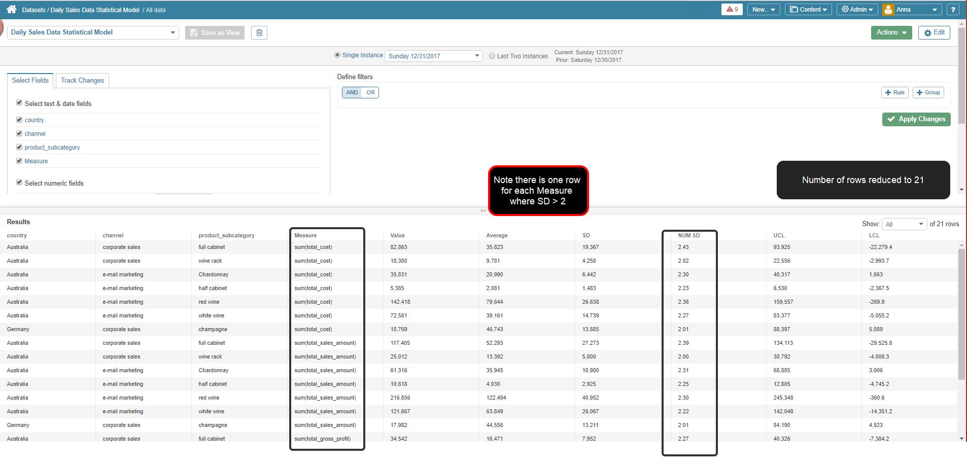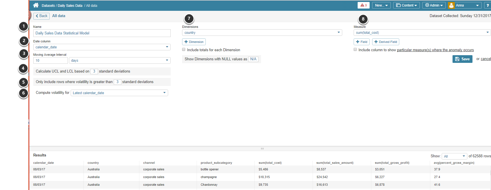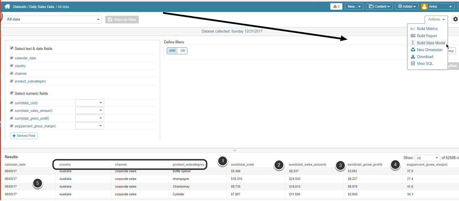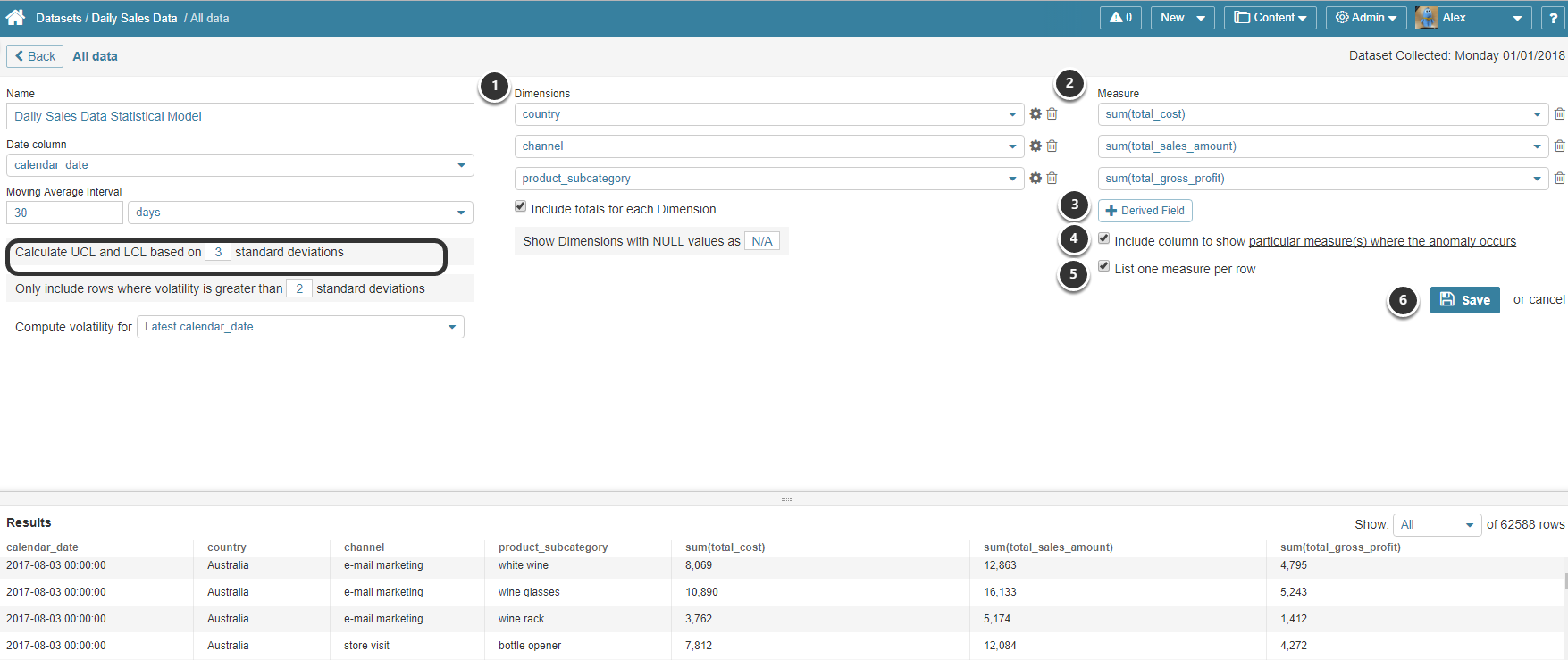 For an example, we will create a Stats Model from an existing Dataset containing sales data from our test database. We want to find any values of 'Cost of Product', 'Sales Amount' or 'Gross Profit' that fall outside of 2 standard deviations from a 30-day moving average. We want to perform this evaluation across these dimensions: Country, Channel, and Product sub-category.