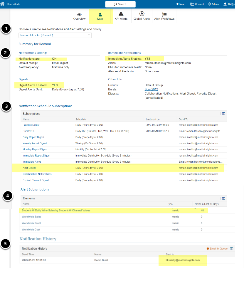 If someone is not receiving Alerts as expected, this feature will assist their manager to verify their Alert setup and Notifications. In order to change any settings, the manager will need to sign in as this User and adjust settings via the menus displayed under the User Name.