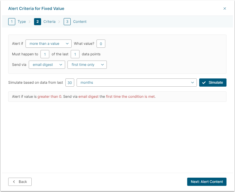 This window is going to have a different set of Alert criteria options depending on the Alert Rule Type selected previously.