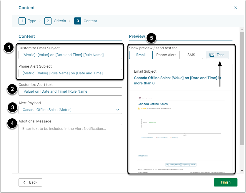 - Preview: This section will display the content as you change it. The User can also trigger a Test Alert to be generated