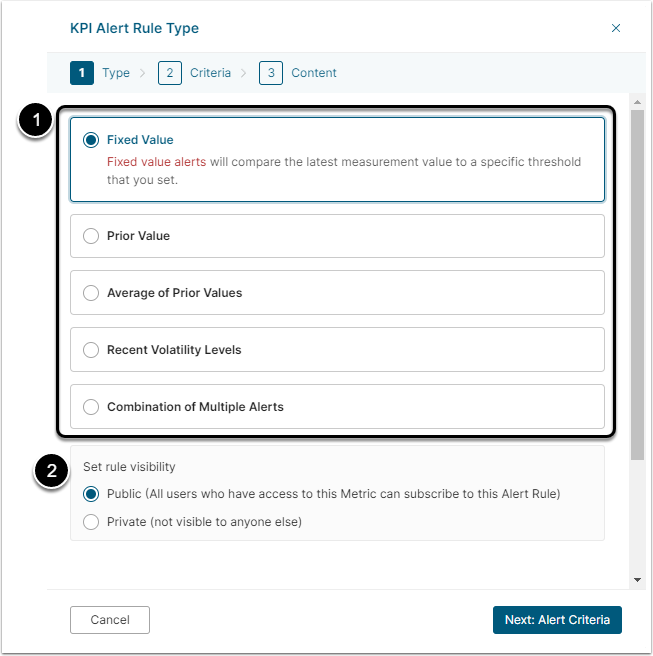 - Choose which Type of Alert Rule you plan to create:- Fixed Value: This will compare the latest measurement value to a specific threshold that you set