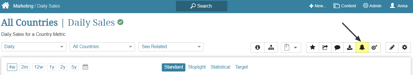 The Alert icon is available on both Metric Previews (from tiles) and Metric Viewers.