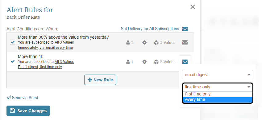 - You can select first time only to prevent Alerts being generated when the alert condition happens more than once in a row (If Daily Metric has a Red Alert everyday, you will only receive one Alert email until at least one day does not trigger a Red Alert)