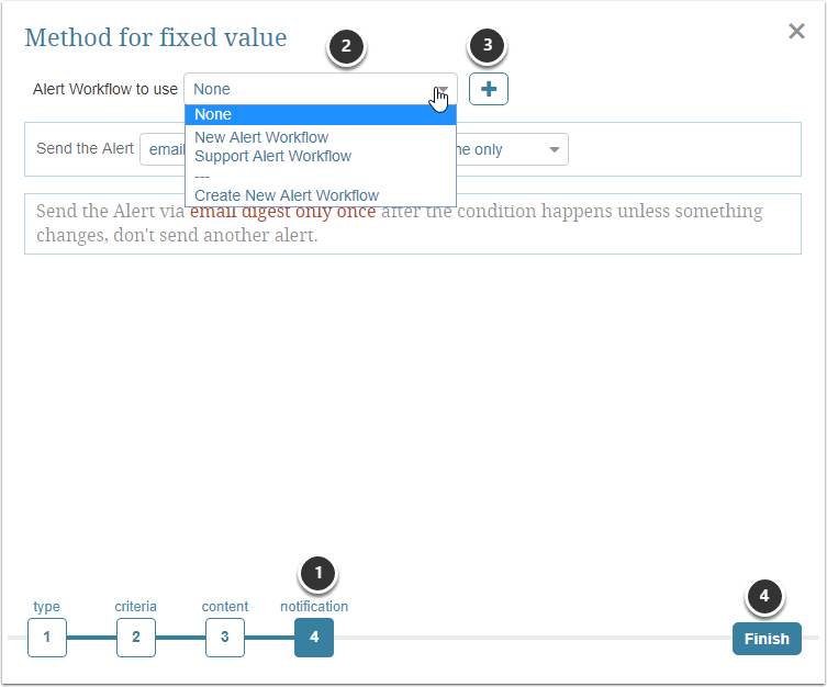 - Once you define the Alert Criteria and Content, your final step (4 - Notification) implies setting up distribution method, frequency and whether any Alert Workflow should be applied to it