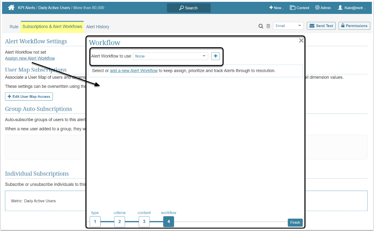 - Choose one of the previously defined Alert Workflows from the drop-down list