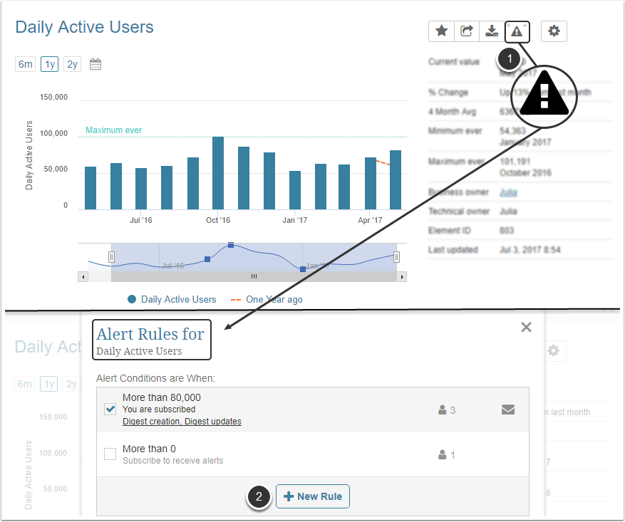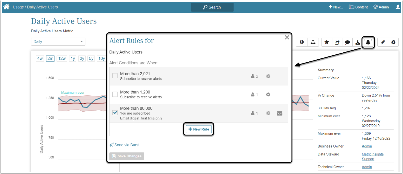 - If no Alert Rules are assigned to this Metric, create one by clicking [+ New Rule]