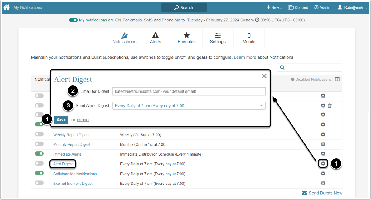 - In the Alert Digest row click the gear icon. The Alert Digest pop-up opens