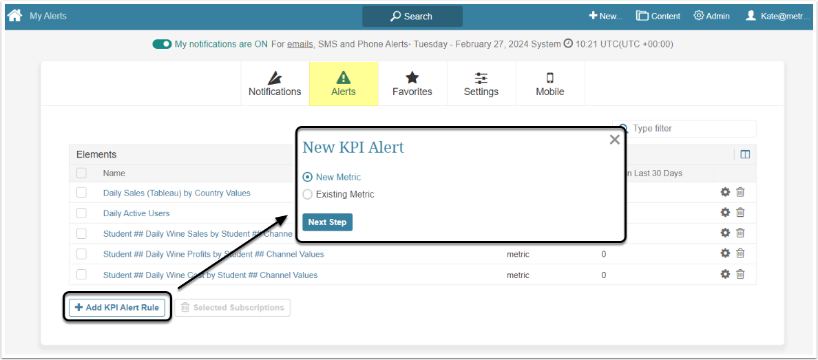 - Existing Metric: Opens a drop-down list of existing Metrics. Choose a Metric and click Next Step to move on to create an Alert