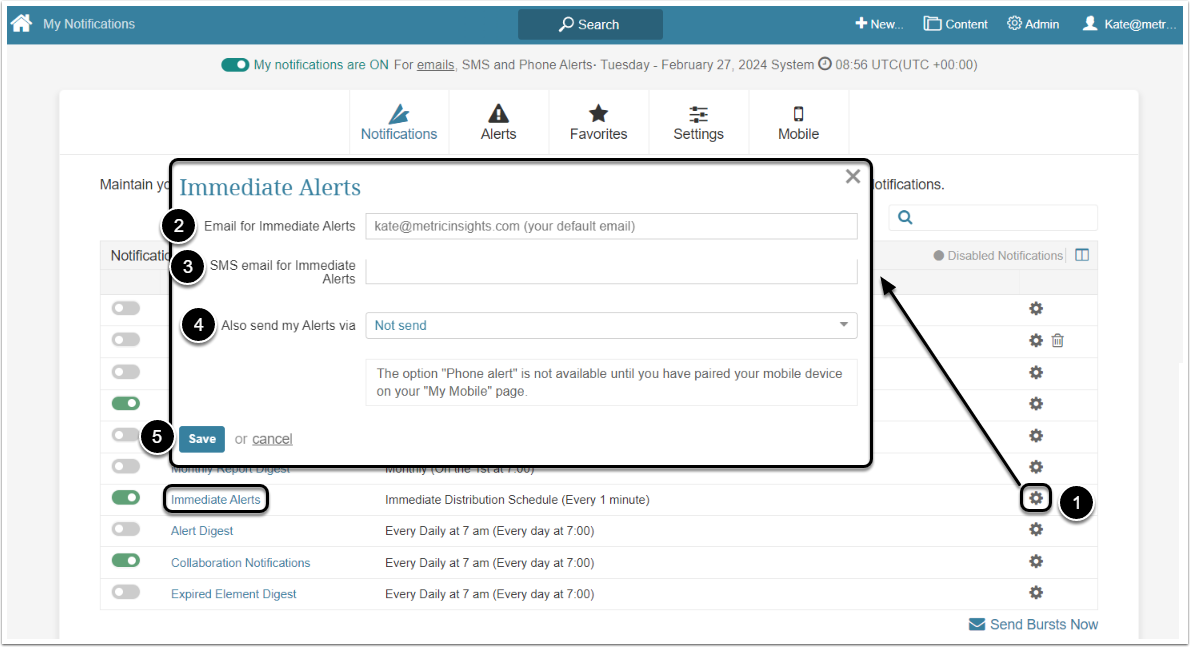 In Metric Insights, Users can set Immediate Alert Notifications and add Alerts to the Alerts Digest via the My Notification section of their User menu. This article walks you through the basic setup: