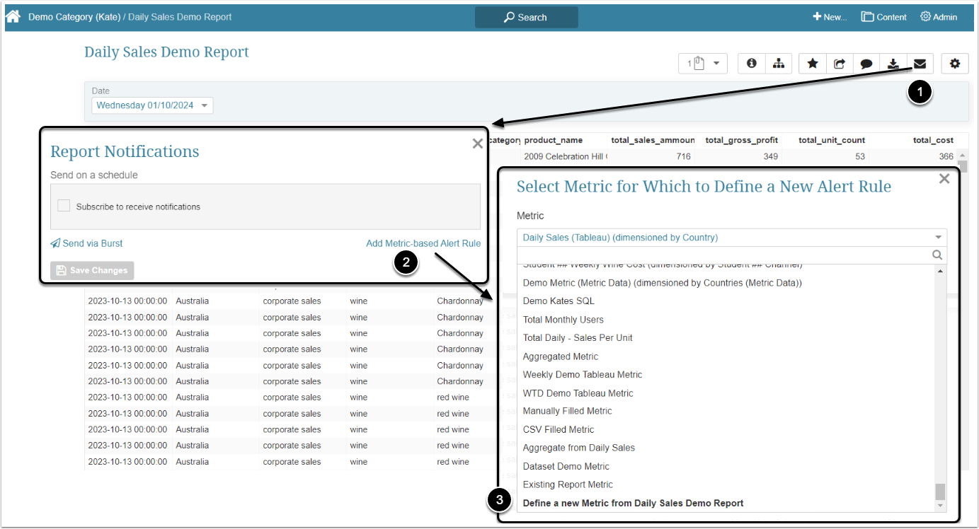 - Select one of the existing Metrics or choose the "Define a new Metric from Daily Sales Demo Report" option- If you have chosen the "Define a new Metric from Daily Sales Demo Report" option define the new Metric's name, measurement period and Category