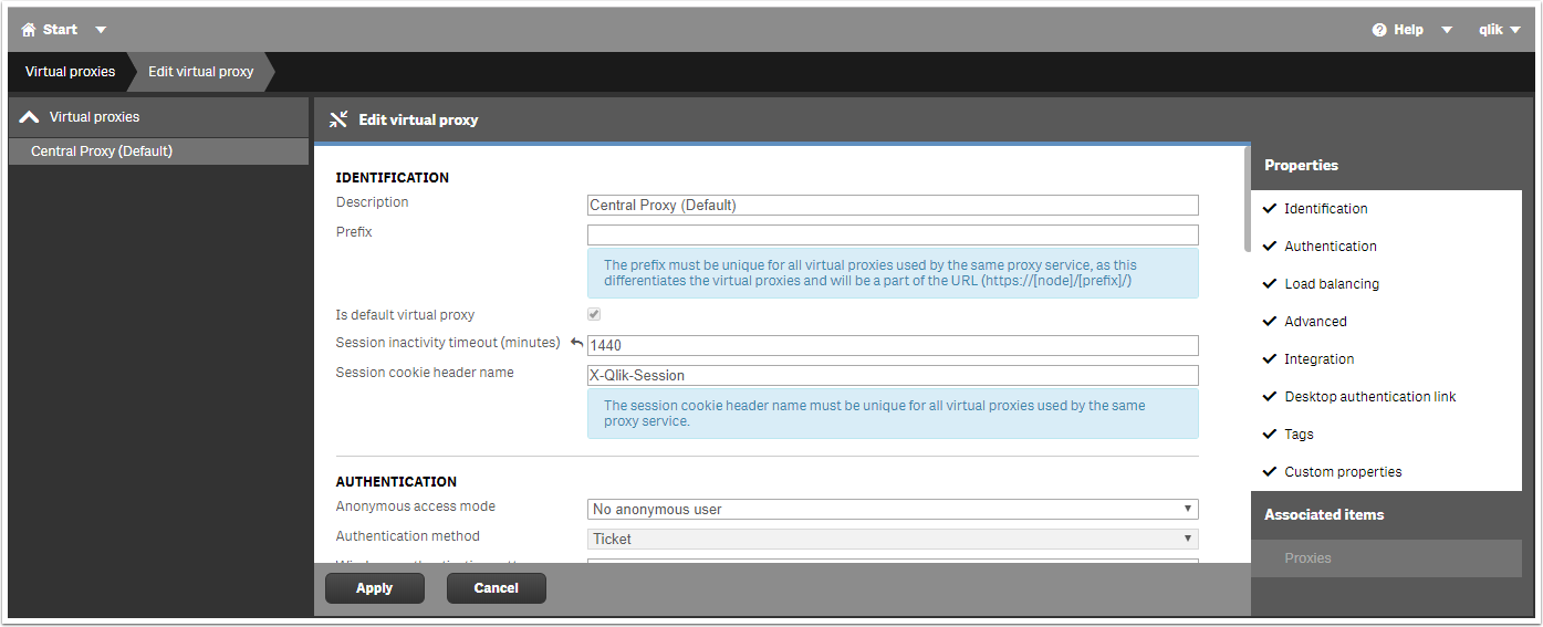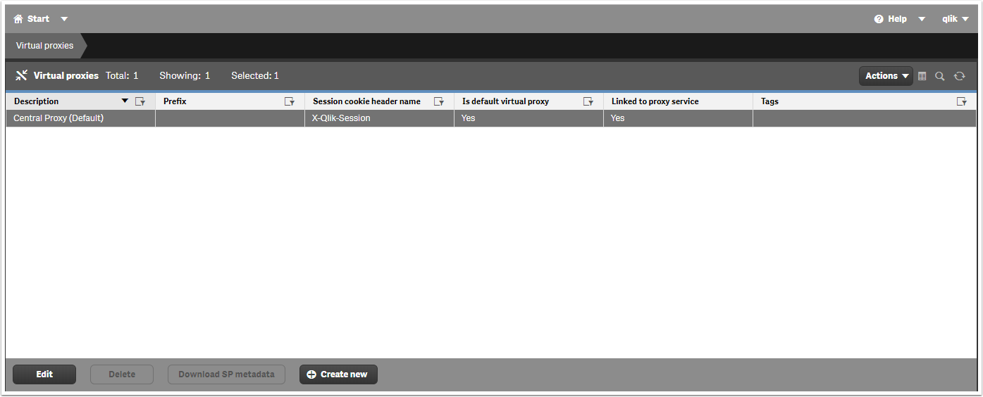 - Access the Virtual Proxies tab in your Qlik Sense QMC using the following URL: http://your-qliksense-server/qmc/virtualproxies