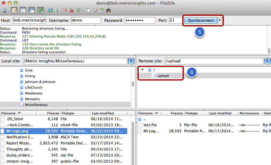 6. Once the connection is established, you should see a directory tree on the right-hand side that includes the 'upload' directory. Double-click it to open it. Then just drag your file from the left-hand side to the upload directory