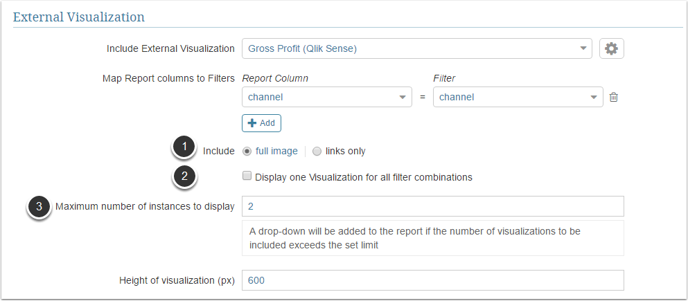 - Find the External Visualization section; the Include External Visualization field is set to 'None' by default. Select the external Report that you have created as a Prerequisite to including Visualization to the Report. This page is dynamic, so additional fields are going to be shown after you select an External Report from the drop-down list.