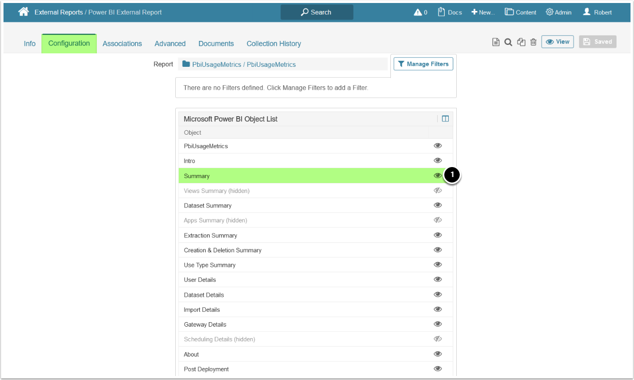 Microsoft Power BI Objects can be hidden either from Plugin Data Source Editor, or directly from the External Report Editor.