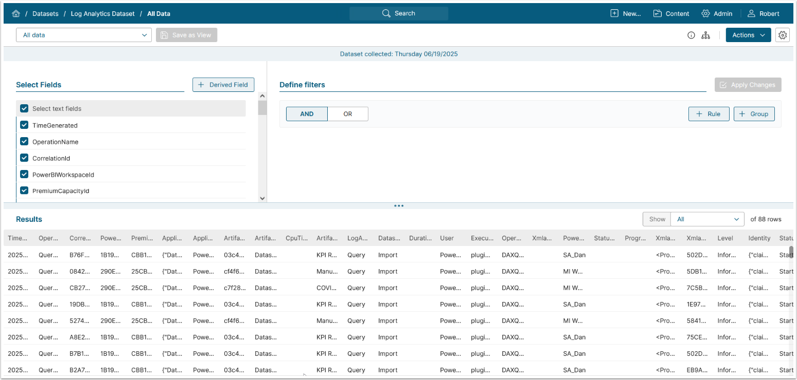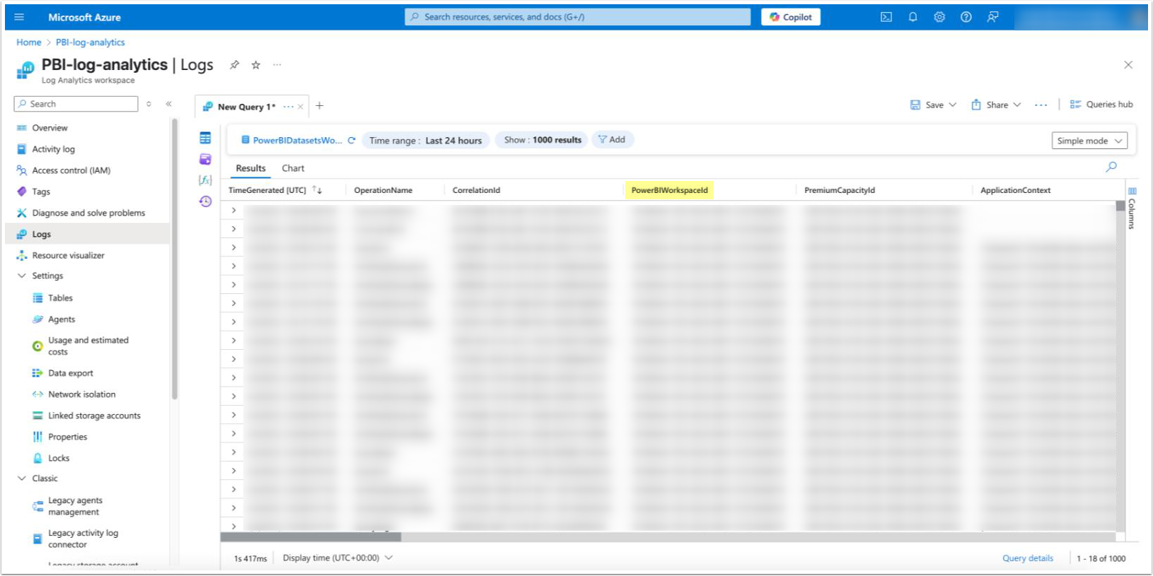 Once done, logs will begin streaming to Azure, and you can confirm this by querying tables such as PowerBIDatasetsWorkspace in the Azure portal.