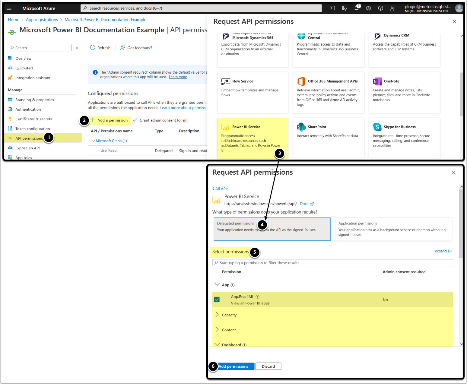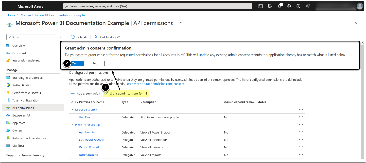 - Enable the following permissions to get a list of all Power BI Apps, Dashboards, Semantic Models, Reports, and Workspaces respectively:-