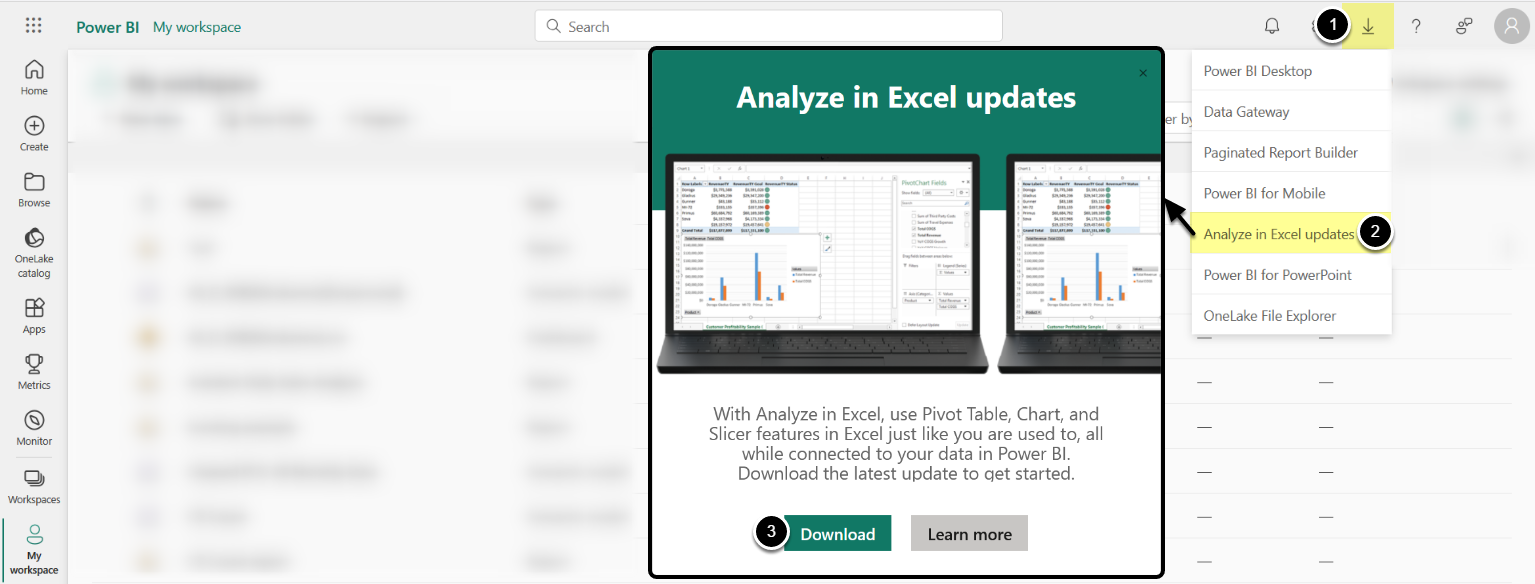 When you select Analyze in Excel updates from the Download menu, Power BI creates an .msi file and downloads it from the browser to your computer. Open the downloaded SQL_AS_OLEDB.msi file and install the adapter.
