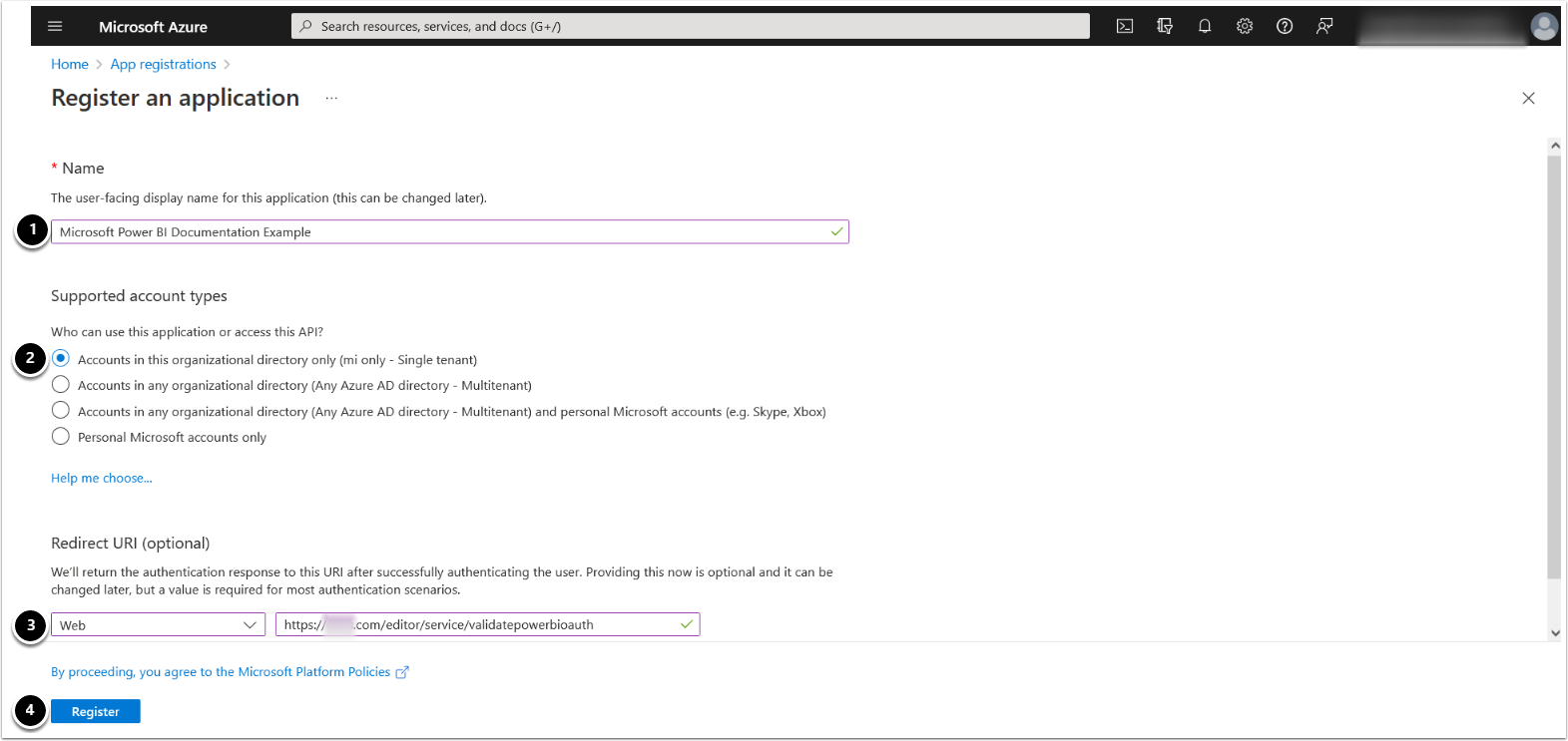 Redirect URI: select Web, enter https://<MI hostname>.com/editor/service/validatepowerbioauth