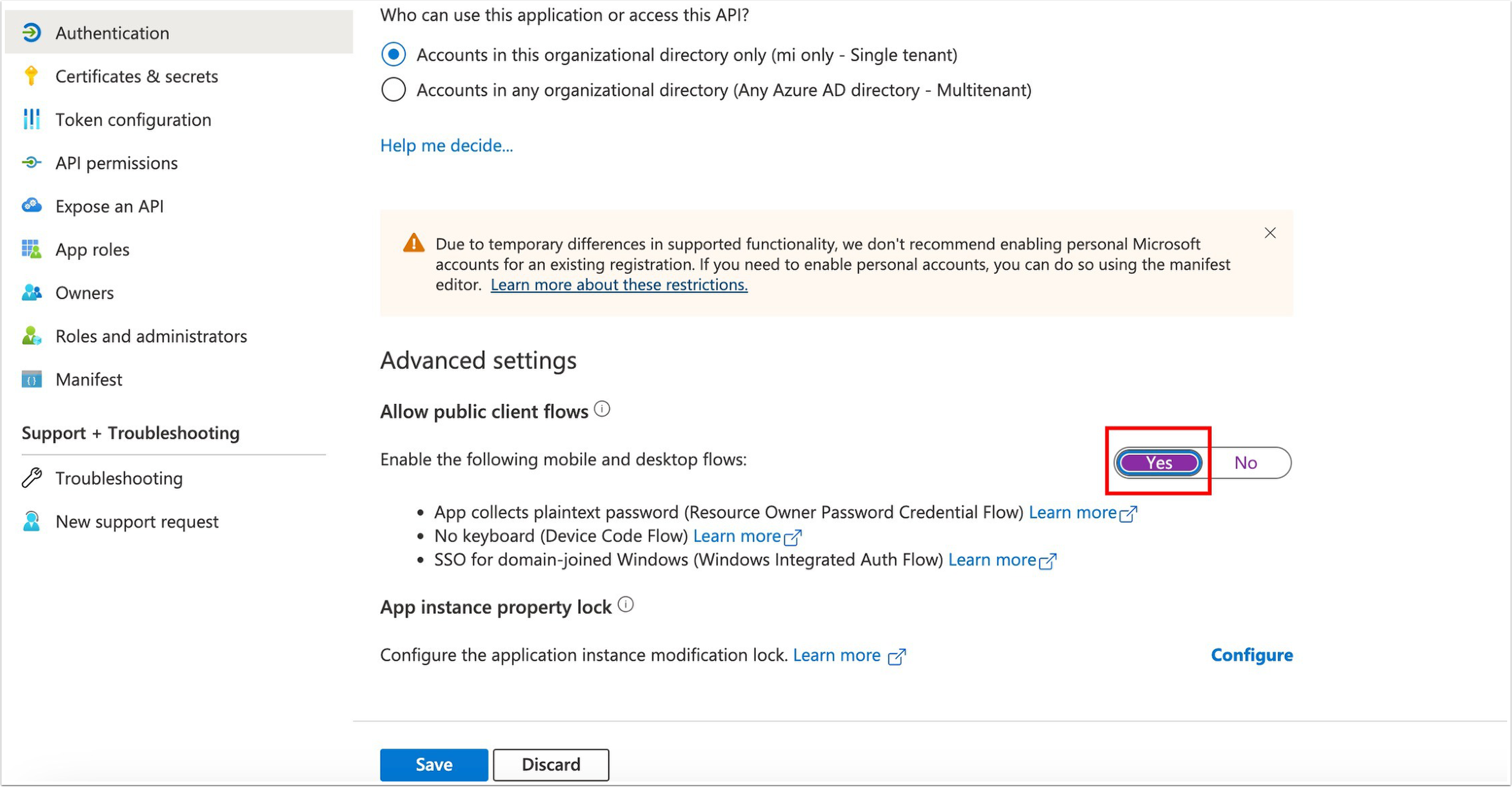 Once the application has been registered, please enable Public Client Flows under the Authentication tab. This step is only required when using Password Authentication - it is not required for OAuth. Public Flows are what allows third party apps (like MI) to get a token using username and password (enabling Metric Insights to get a token by itself).