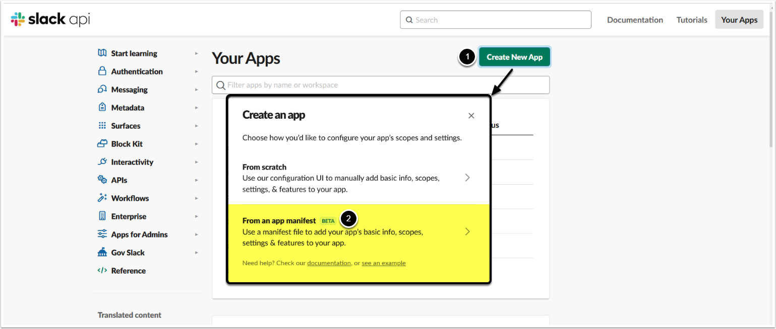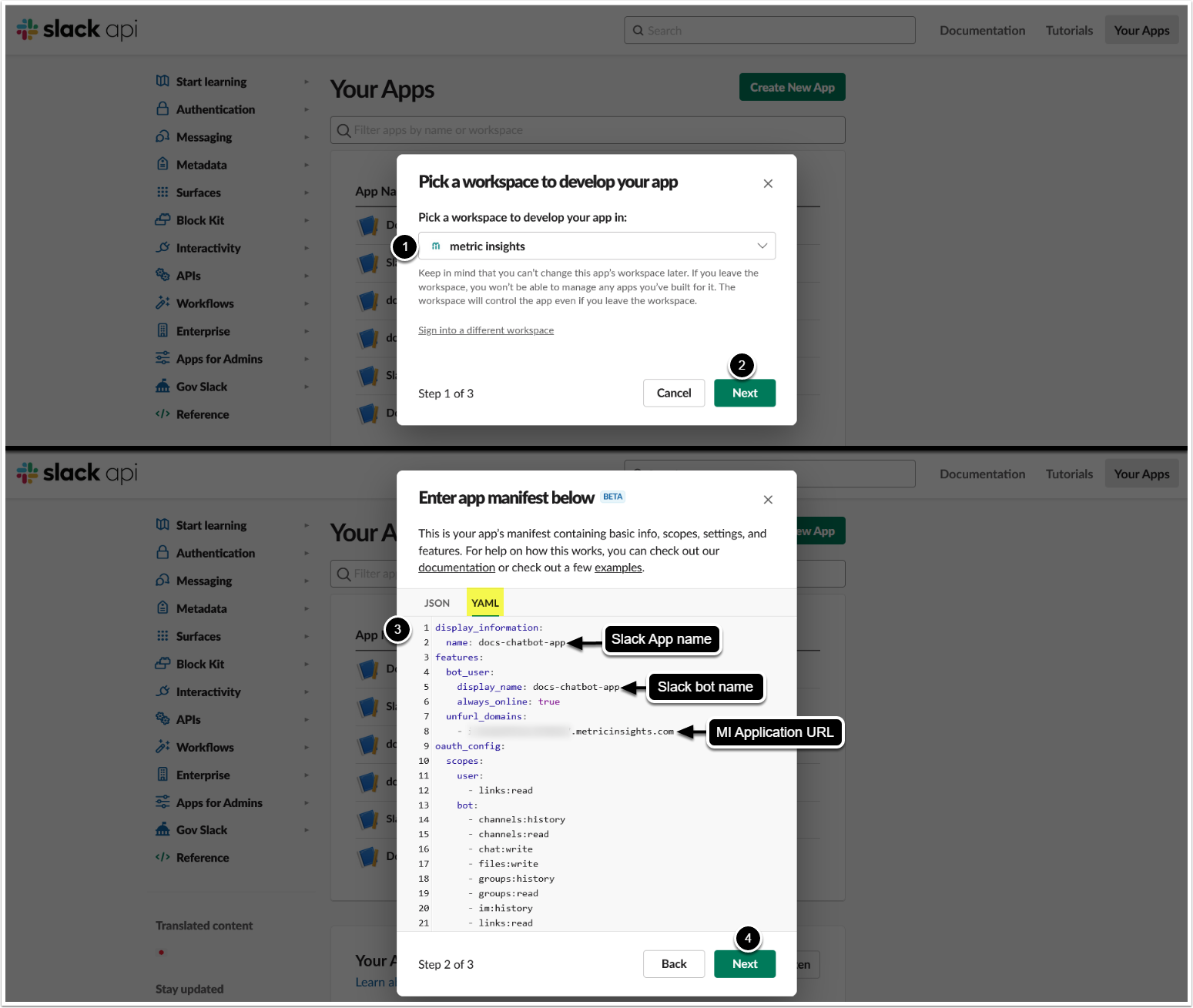 - On the YAML tab, provide the YAML with the Slack App configuration, use the .ymlfile below replacing the values of the next three parameters:-