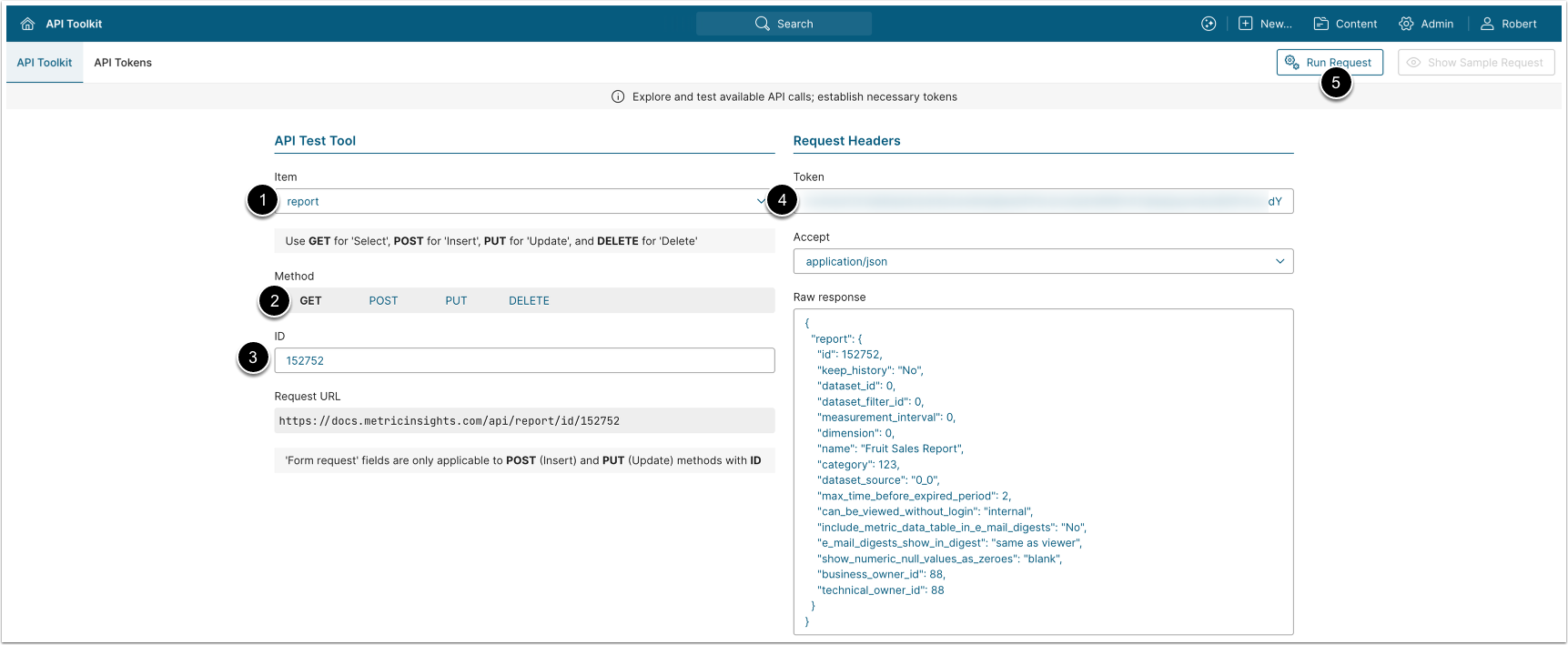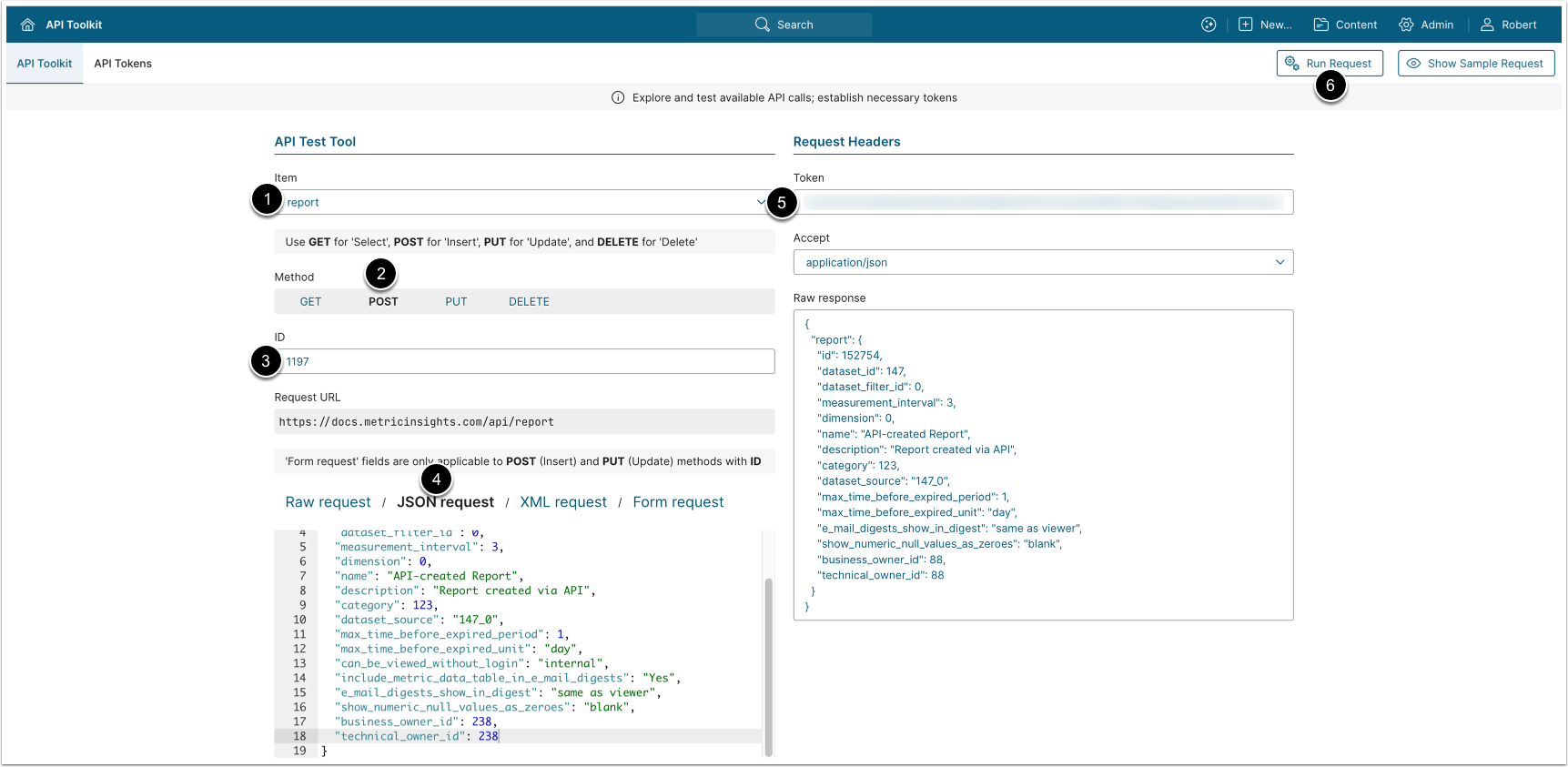 - Select JSON request and enter JSON providing the needed values for your Report: