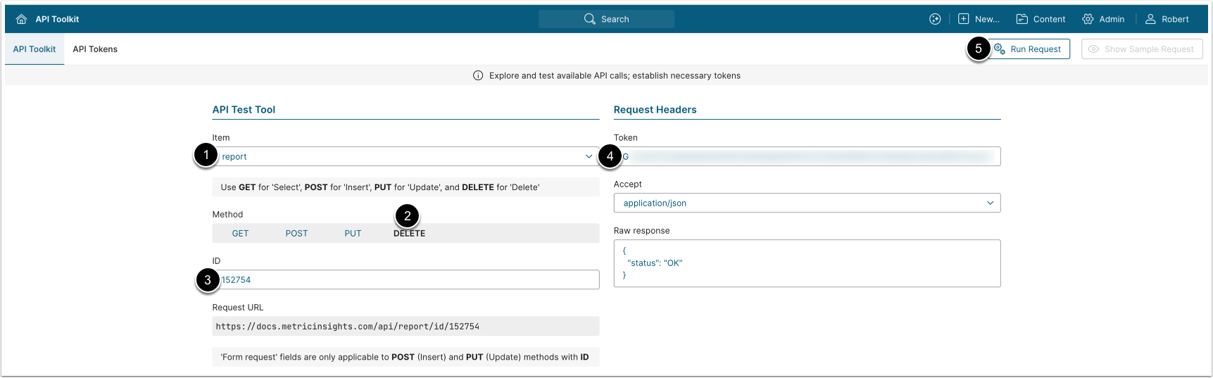 The DELETE request to /api/report/id/<id> deletes a selected Report.