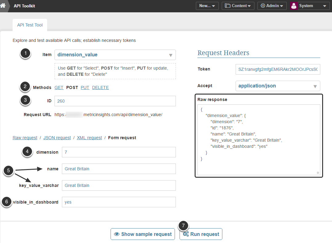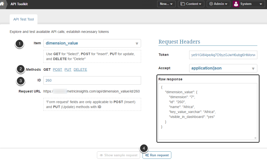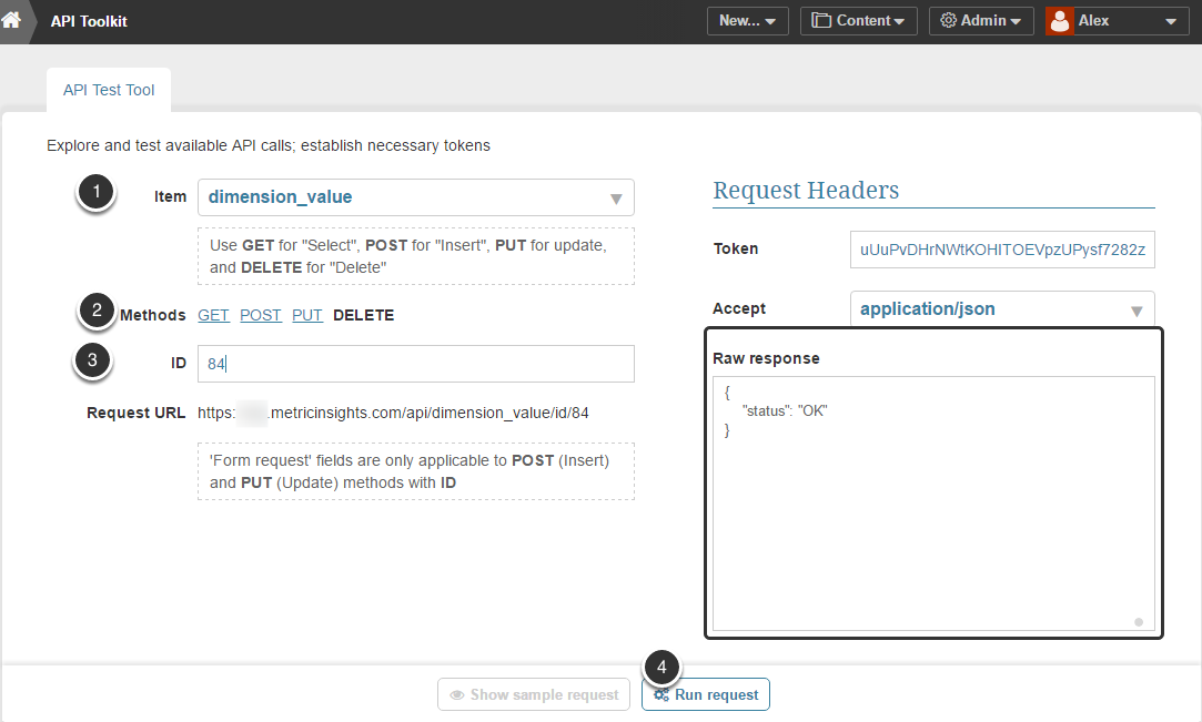 - ID: Find an existing Dimension Value that you wish to use as a foundation for new Alert. To see the list of all Dimension Values created in the system, select GET method, keep this field empty and Run request