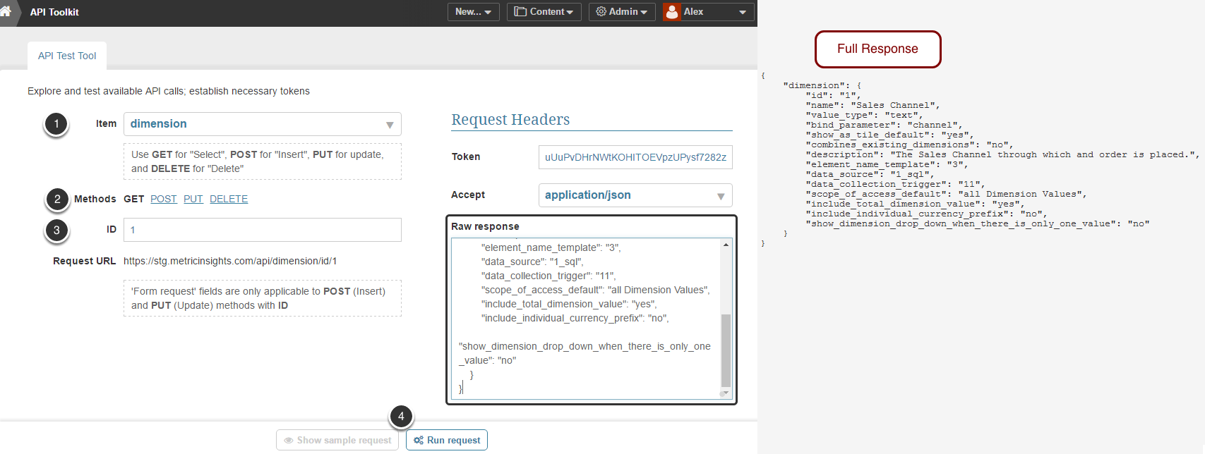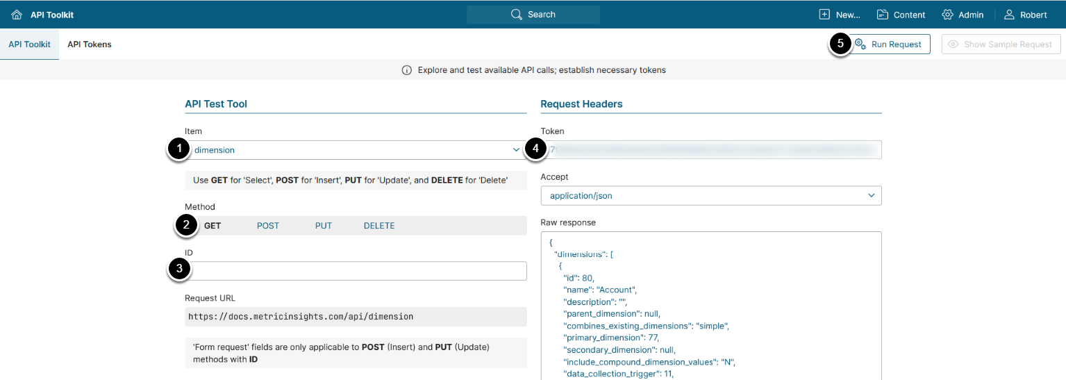 - ID: Find an existing Dimension that you wish to use as a foundation for new Alert. To see the list of all Dimensions created in the system, select GET method, keep this field empty and Run request
