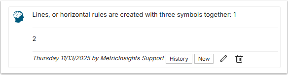 The following markdown code inserted, for example, in an Expert Analysis, produces four lines as shown below: