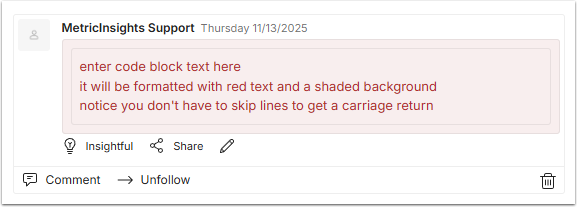 The following markdown code inserted, for example, in a Comment, produces the Code Block shown below: