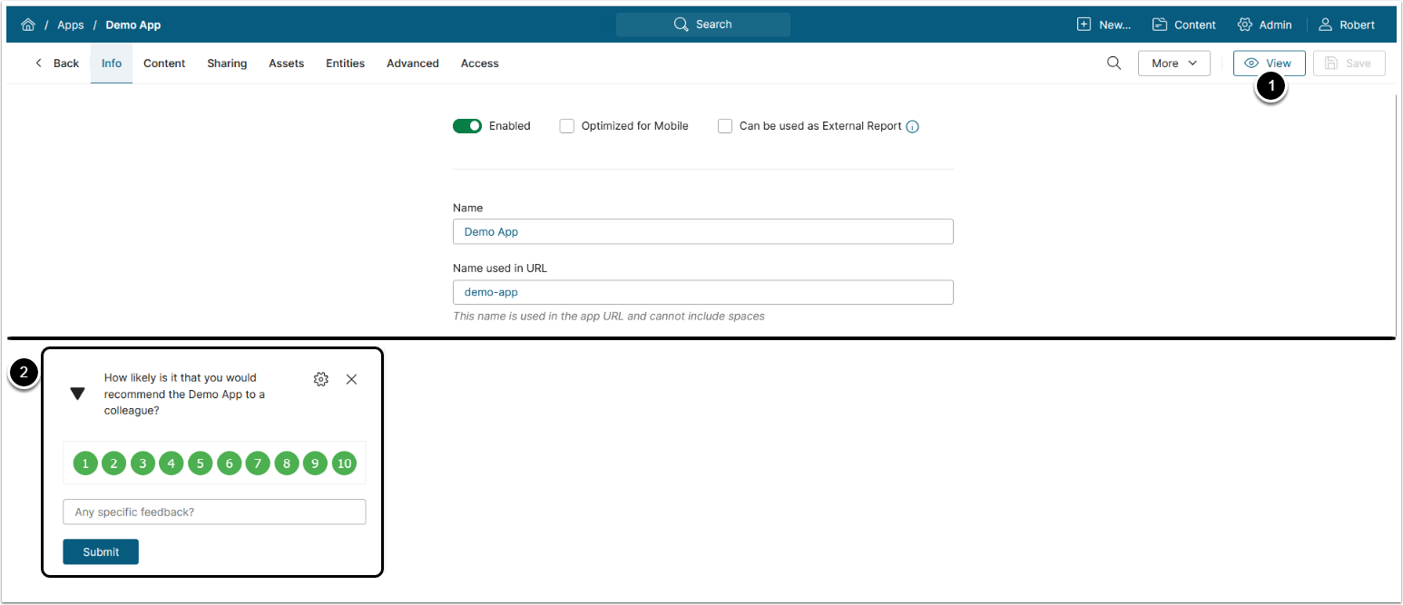 Default Value: Enter the Name used in URL of the App created from the current App Template. This App will display the Feedback Prompt