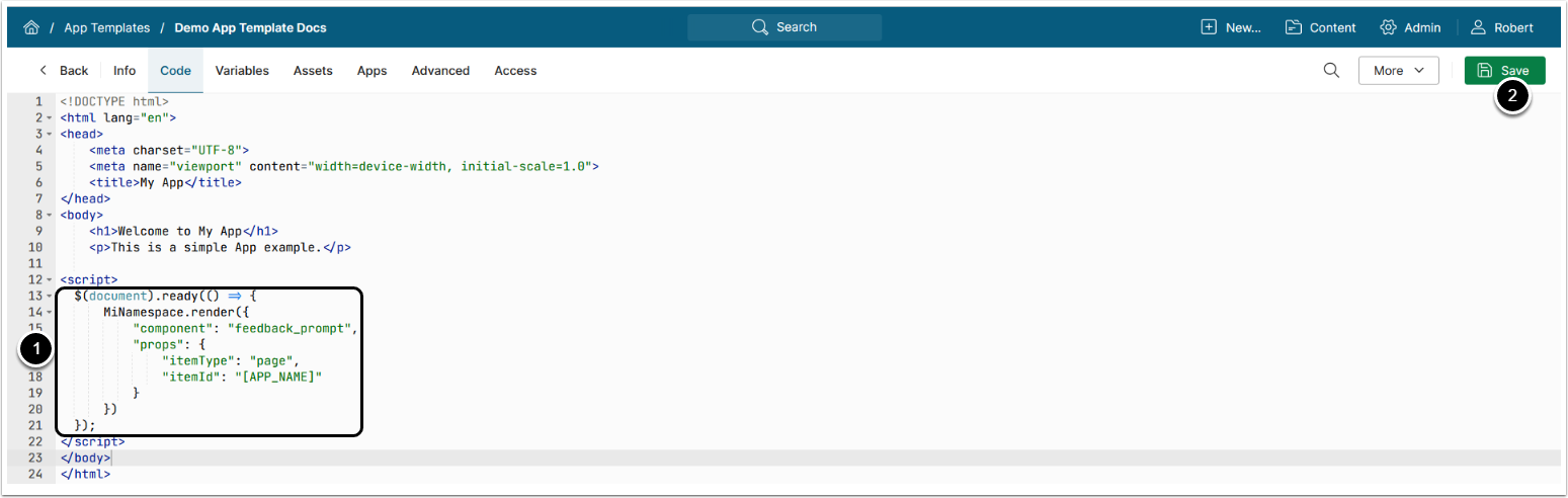 This article describes how to embed a Feedback Prompt on an App created from an App Template.