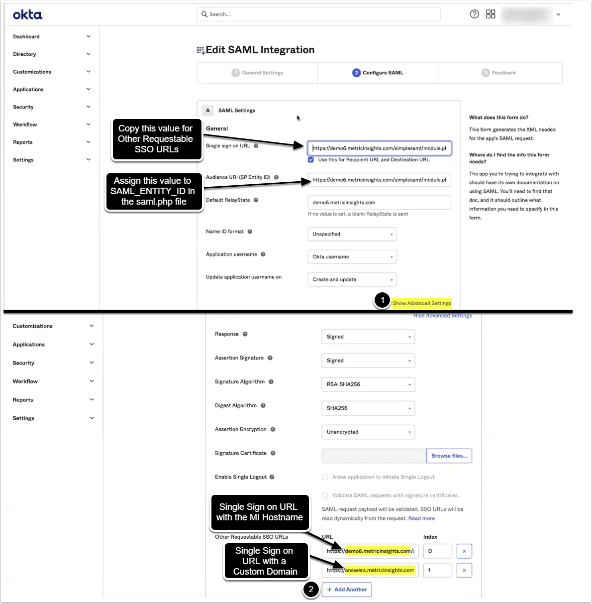 - URL: Copy the value from the Single sign on URL and replace the hostname with the Custom App URL